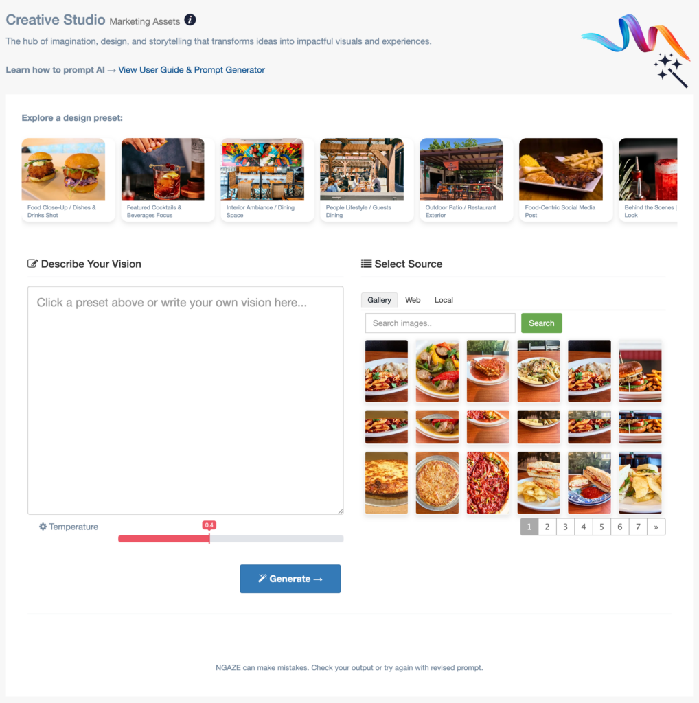 The Creative Studio is NGAZE’s AI-powered design and content workspace. It helps you create marketing visuals and creative assets for your restaurant quickly—without needing a designer or external tools.